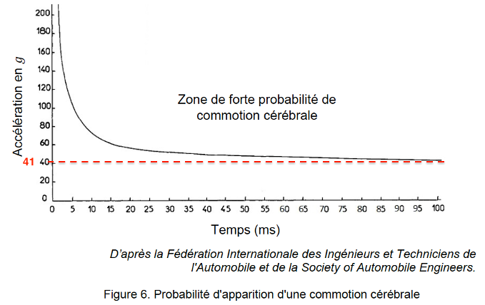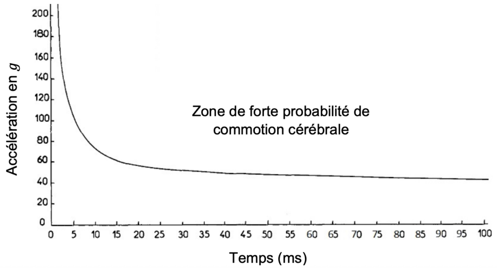 La courbe suivante délimite la zone de forte probabilité d’apparition d’une commotion cérébrale en fonction de la valeur et de la durée de l’accélération subie par la tête.