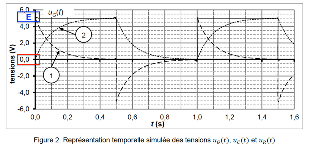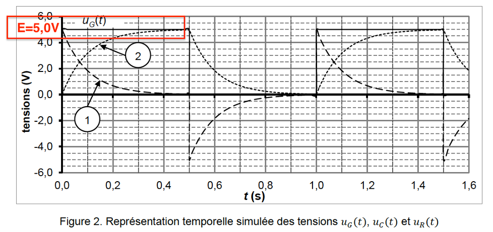 1.4. Associer les courbes 1 et 2 de la figure 2 aux tensions 𝑢𝐶(𝑡) et 𝑢𝑅(𝑡). Justifier.