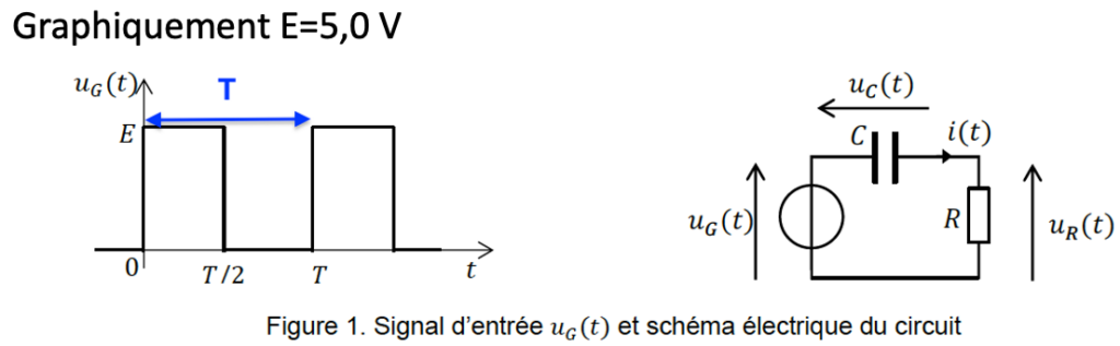 Cette tension en créneaux prend alternativement des valeurs 𝐸 et 0 V, sa période est notée 𝑇. Le schéma de la figure 1 en propose une représentation.