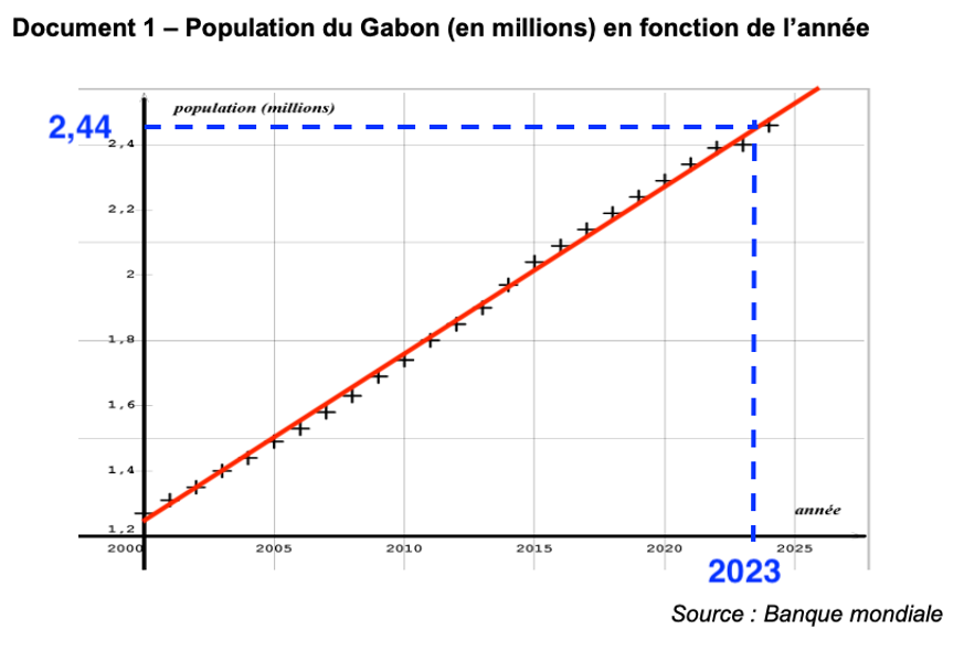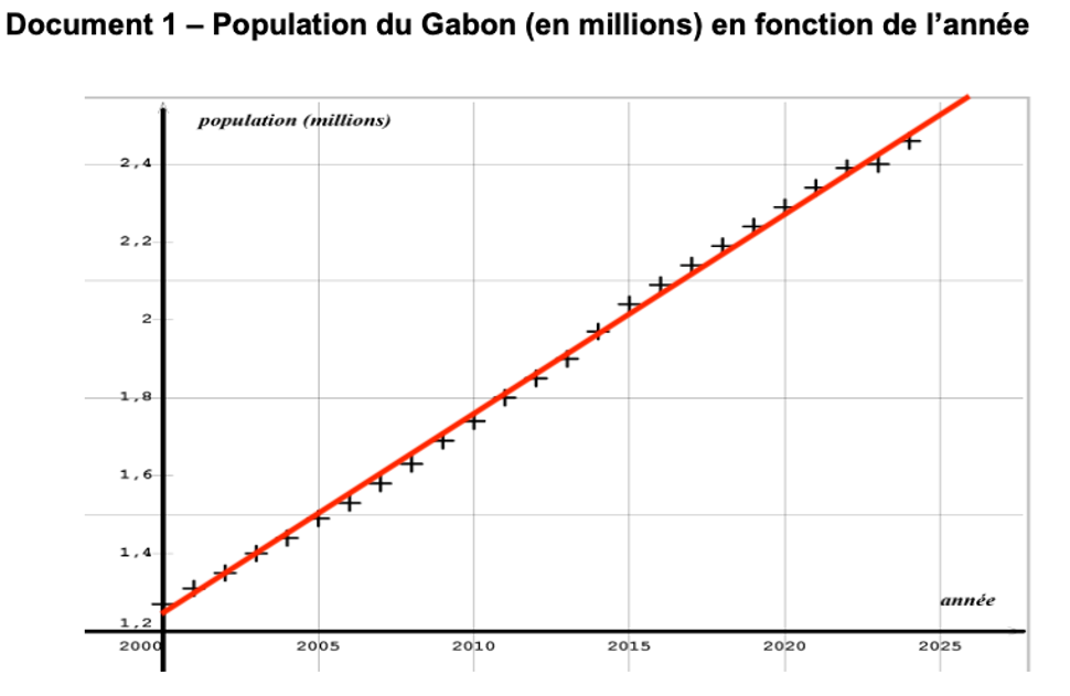 Le document 1 montre que la Population du Gabon (en millions) en fonction de l’année est une droite. La population augmente donc linéairement.