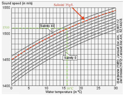 La célérité des ultrasons dépend de la salinité et de la température de l’eau de mer :