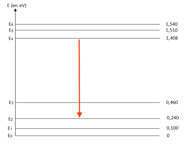 2.3.1. Vérifier, par un calcul, que les niveaux d’énergie mis en jeu lors de l’émission du faisceau laser sont les niveaux E2 et E4.