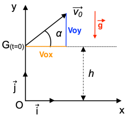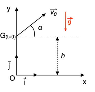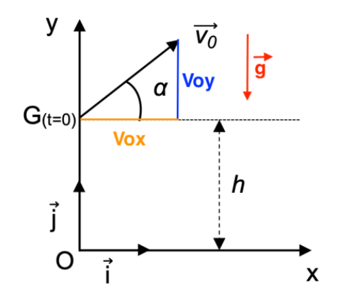 Quand le bâton quitte la main du joueur, son centre de masse G est situé à une hauteur h par rapport au sol avec un vecteur vitesse initial $\overrightarrow{v_0}$ qui forme un angle α avec l’horizontale.