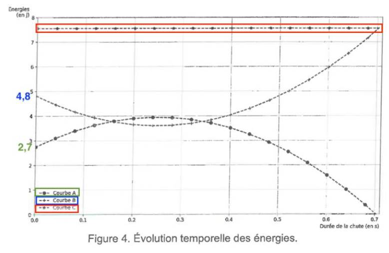 La courbe de l’énergie mécanique est donc au-dessus des courbes de l’énergie cinétique et l’énergie potentielle de pesanteur : courbe C