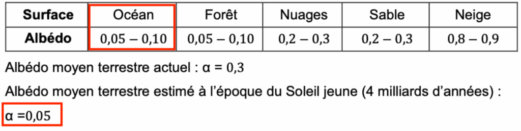 7 – Sachant qu’il y a 4 milliards d’années, la Terre était quasiment intégralement recouverte par un océan, justifier la valeur proposée pour la valeur de l’albédo à cette époque. Expliciter l’hypothèse sous-jacente concernant la densité de la couverture nuageuse à l’époque.