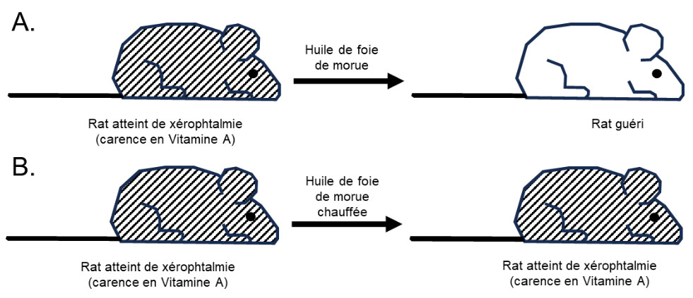 Dans l’expérience A, des rats atteints de xérophtalmie traités avec de l’huile de foie de morue se sont rétablis, tandis que dans l’expérience B, des rats atteints de la même maladie et traités avec de l’huile de foie de morue chauffée ne se sont pas améliorés. Cela indique que le facteur qui guérit les rats de la xérophtalmie est présent dans l’huile de foie de morue, mais qu’il est détruit lorsqu’elle est chauffée.