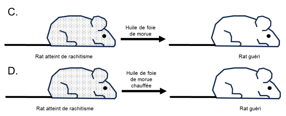 Dans l’expérience C, des rats atteints de rachitisme traités avec de l’huile de foie de morue se sont rétablis, et dans l’expérience D, des rats atteints de rachitisme et traités avec de l’huile de foie de morue chauffée se sont également rétablis. Cela suggère que le facteur qui guérit les rats du rachitisme est présent dans l’huile de foie de morue et qu’il n’est pas détruit par la chaleur.