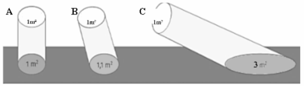 La puissance solaire reçue au sol dépend principalement de l’angle d’incidence des rayons du soleil. Au cours de la journée, cet angle change en raison de l’inclinaison du rayonnement solaire.