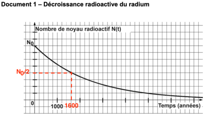 2 – Déterminer, à l’aide du graphique du document 1, la demi-vie du radium.