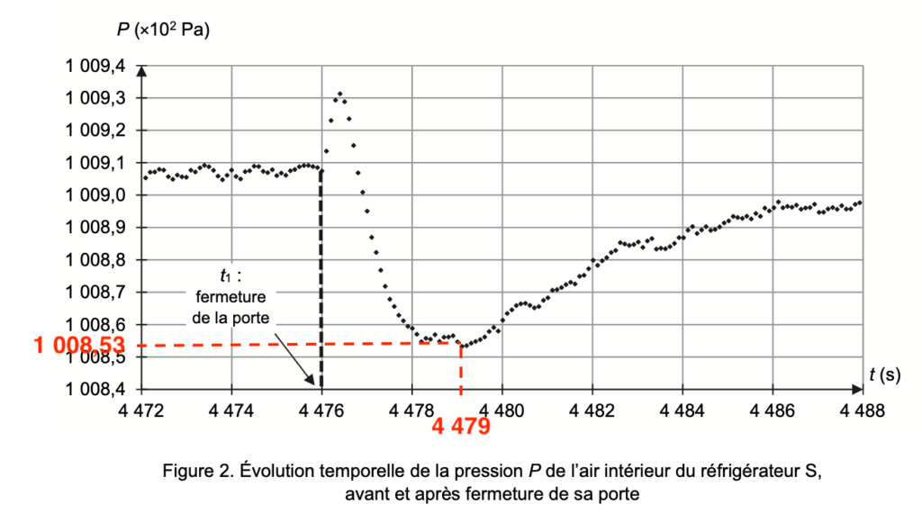 Dans certains cas, la réouverture d’une porte de réfrigérateur juste après fermeture, peut s’avérer difficile. Afin d’expliquer ce phénomène, on enregistre la pression de l’air à l’intérieur du réfrigérateur lors d’une expérience pour laquelle, le réfrigérateur étant ouvert, on en ferme la porte à un instant t1. L’évolution de la pression mesurée est représentée sur la figure 2. On s’intéresse à la réouverture la porte après une durée Δt suivant la fermeture.