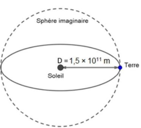 Avec 𝑃𝑇 la puissance totale du soleil qui vaut 3,87 × 1026 W et 𝑆 la surface de la sphère imaginaire.