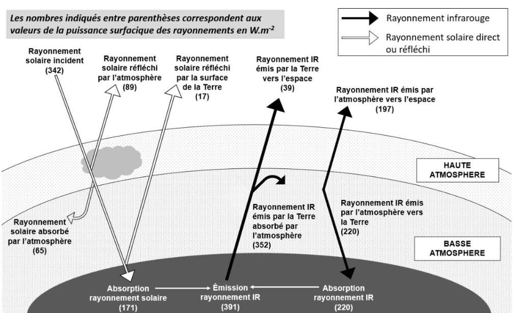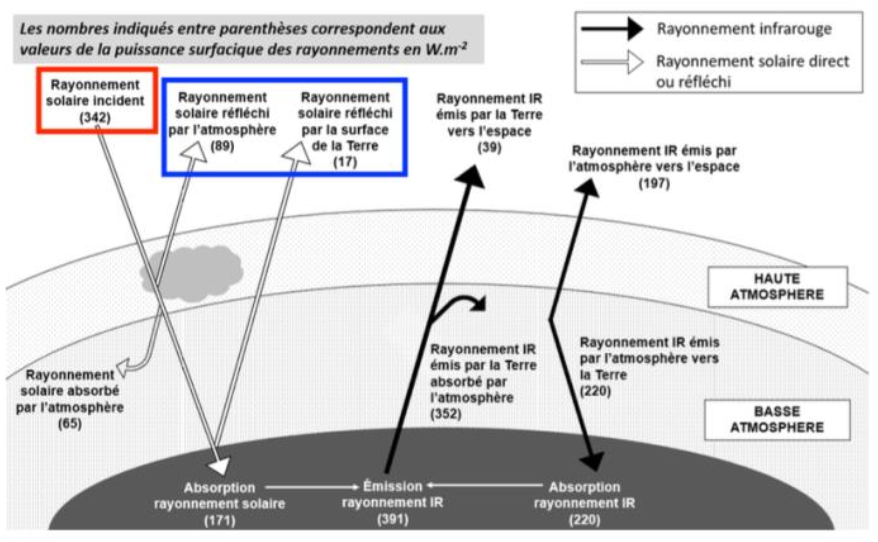 Le schéma ci-dessous présente les flux énergétiques émis, diffusés et réfléchis par les différentes parties de l’atmosphère et de la surface terrestre.