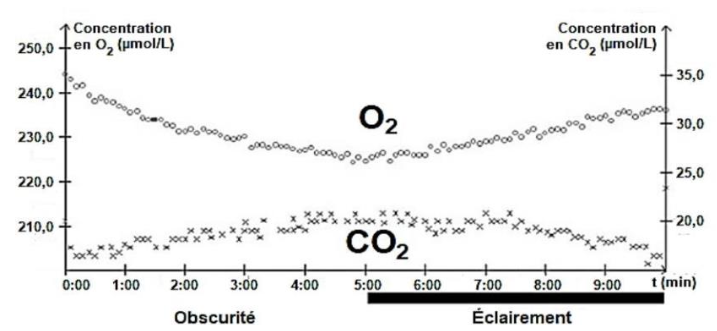 De la glace rose contenant des Chlamydomonas nivalis est fondue et placée dans une enceinte hermétique. Les teneurs en dioxygène et en dioxyde de carbone dans l’eau sont relevées sous différentes conditions d’éclairement. Le graphique ci-dessous présente l’évolution des teneurs en dioxygène et dioxyde de carbone dans de l’eau contenant Chlamydomonas nivalis.