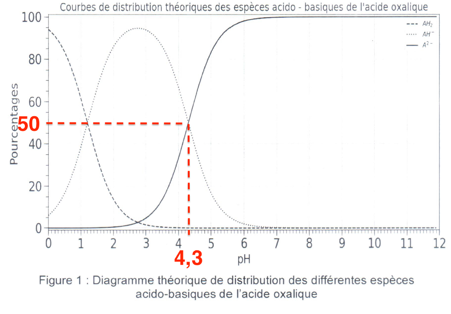 2.2. À l’aide de la figure 1, déterminer la valeur du pKa de la deuxième acidité de l’acide oxalique.