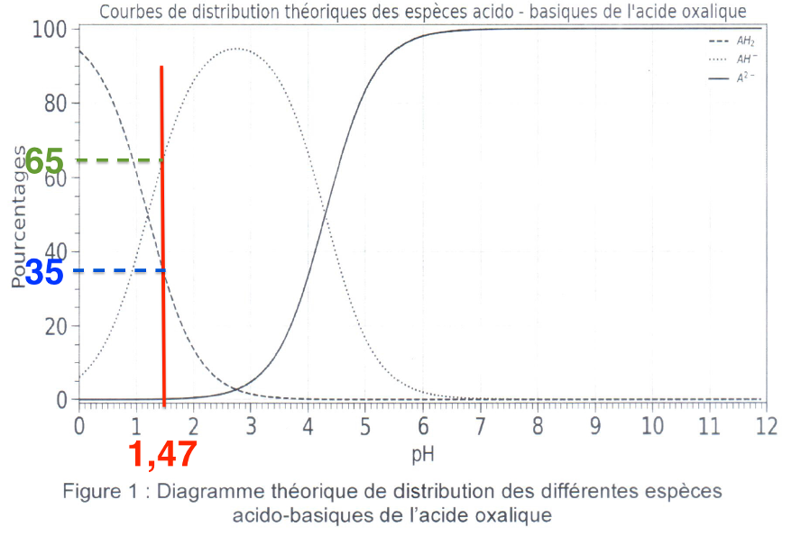 2.3. À l’aide de la figure 1 et de la valeur du pH réel de la solution, donner le pourcentage approximatif de chaque espèce présente dans la solution puis, justifier que l’on peut émettre l’hypothèse selon laquelle l’acide oxalique se comporte comme un monoacide.