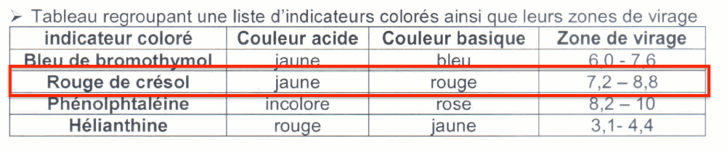 | Rouge de crésol | jaune | rouge | 7,2 – 8,8 |