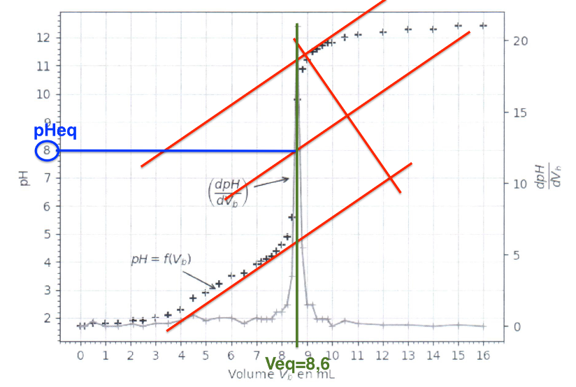 Avec $V_{eq}=8,6\ mL$ (méthode des tangentes parallèles ou lecture graphique au pic de la dérivée)