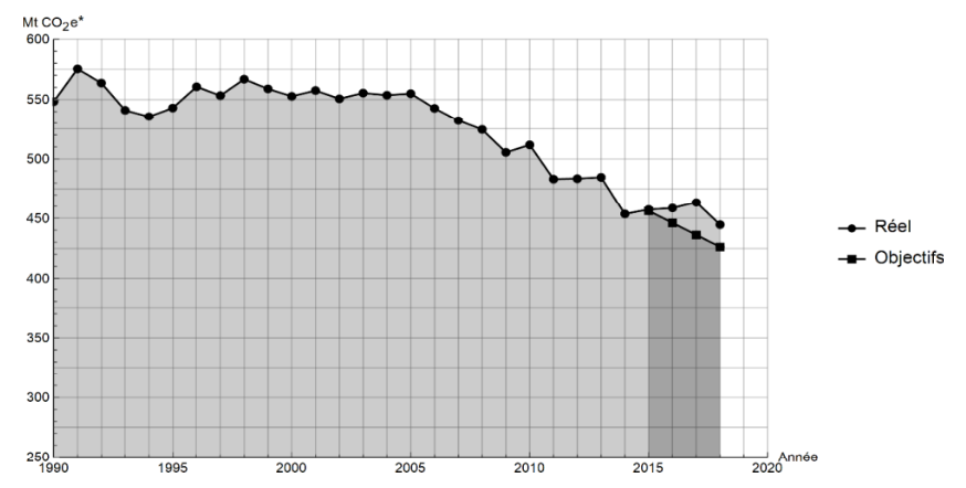 Les émissions nationales de gaz à effet de serre (représentées ici par la masse équivalente de CO2 en millions de tonnes émise chaque année) ont baissé de 4,2 % entre 2017 et 2018 après trois années de hausse consécutives. Cette réduction est en partie liée à un hiver plus doux qui a nécessité une utilisation moins importante de chauffage.