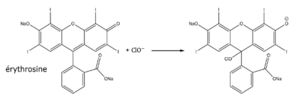 En cas de taches, l’érythrosine peut être décolorée par les ions hypochlorite ClO apportés par une solution d’eau de Javel. Un composé incolore se forme selon l’équation :
