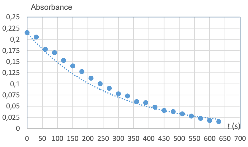 10. Montrer, en utilisant le résultat de la question 2, que si la décoloration de l’érythrosine suit une loi de vitesse d’ordre 1, alors l’évolution de l’absorbance en fonction du temps est une exponentielle.