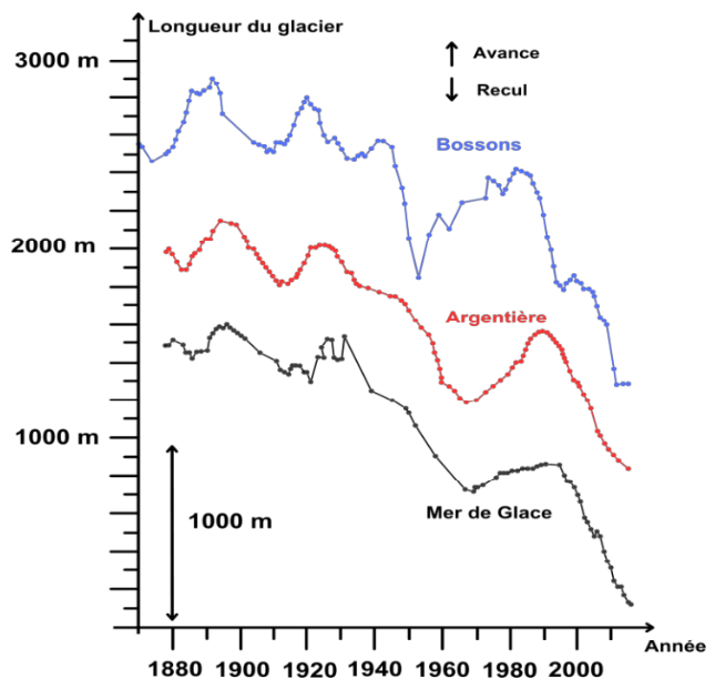 Document 1 – Recul du front de trois grands glaciers du Massif du Mont Blanc depuis la fin du 19ème siècle