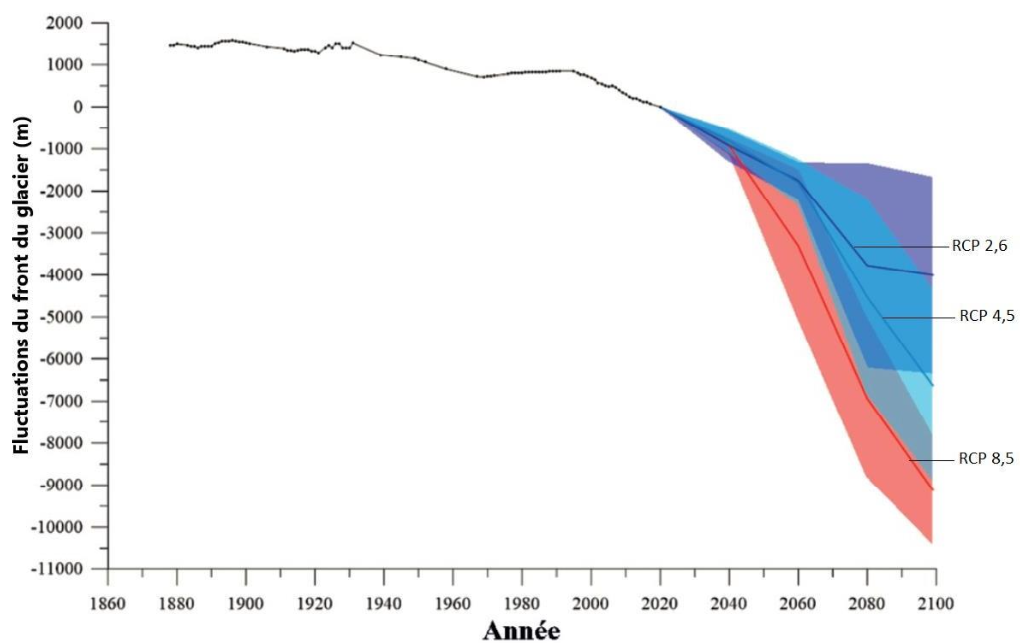 - Scénario RCP 2.6 (faibles émissions) : le recul du glacier est de 4000 m.