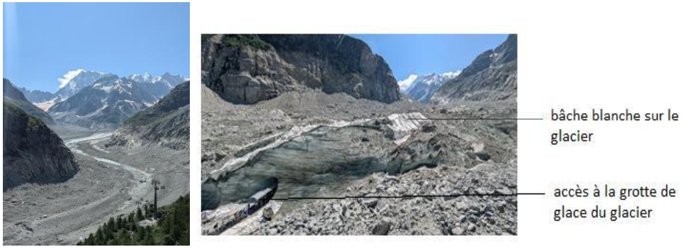 1- À l’aide du document 1, montrer en quoi l’étude des glaciers actuels dans le Massif du Mont Blanc témoigne de l’existence d’un réchauffement climatique récent.
