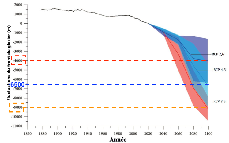 - Scénario RCP 4.5 (émissions modérées) : le recul du glacier est de 6500 m.
