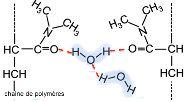 Ainsi les molécules d’eau s’insèrent entre les chaines de polymère, c’est pourquoi on parle d’hydrogels « superabsorbants ».