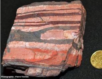 Exploités comme gisements de fer, les formations de fer rubanés sont des roches sédimentaires formées en grandes quantités dans les océans entre – 3,8 et – 2,2 milliards d’années. Elles contiennent du fer à l’état oxydé, issu de l’oxydation du fer qui était présent à l’époque dans les océans sous forme d’ions Fe2+.