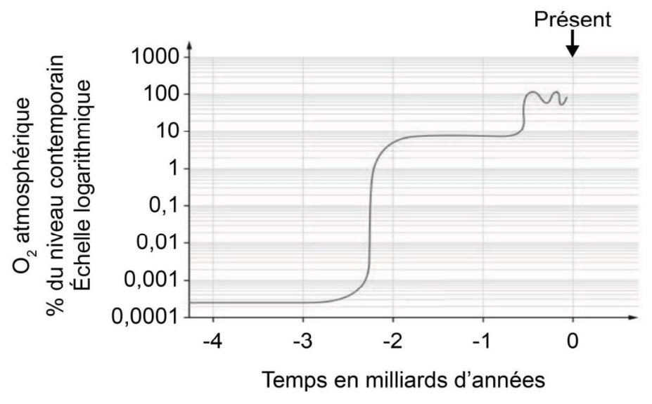 A partir de -2,4 milliards d’années on observe une augmentation brutale du taux de dioxygène dans l’atmosphère.