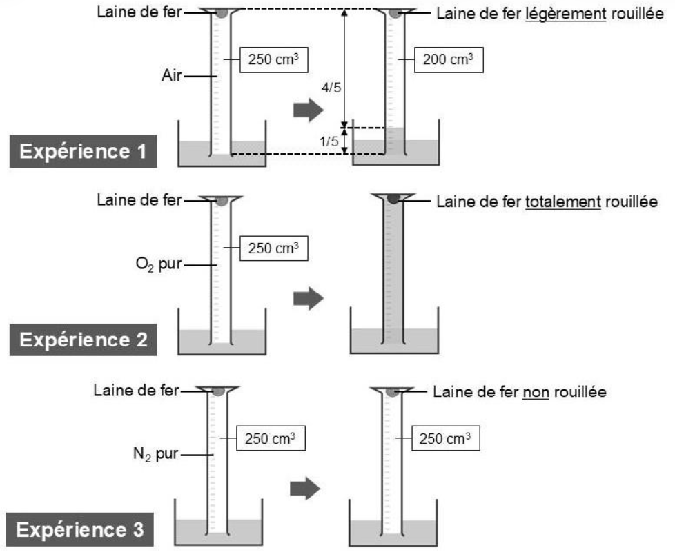 Dans l’expérience 1, avec 250 cm³ d’air, la laine est légèrement rouillée et il reste 200 cm³ de gaz.
