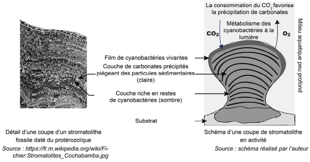 Dans une eau chaude et peu profonde, les cyanobactéries contenues dans les stromatolithes fabriquent leurs propres molécules organiques selon la réaction chimique suivante :