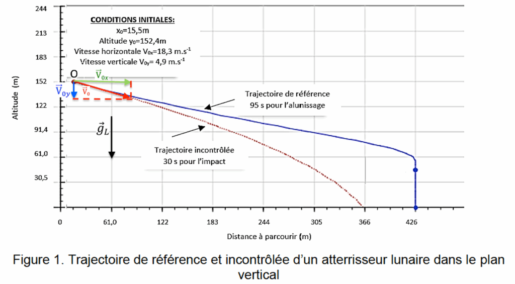 La trajectoire de référence d’une durée de 95 s, permet de poser le module sur le sol lunaire en toute sécurité.