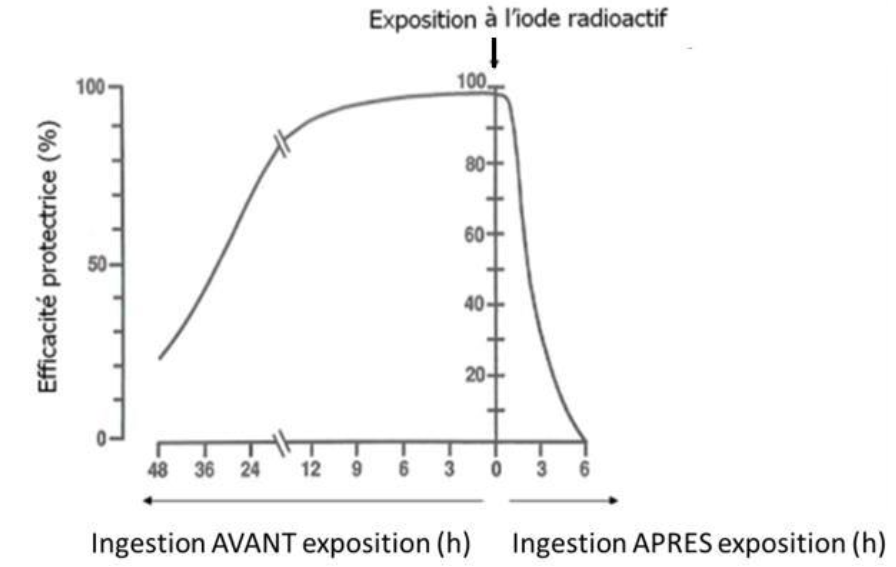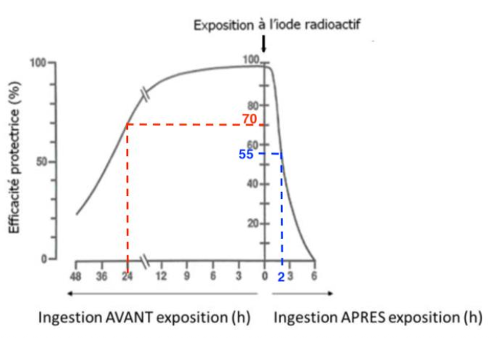 Pour une ingestion 2 h après l’exposition à l’iode radioactif, l’efficacité protectrice est de 55%.