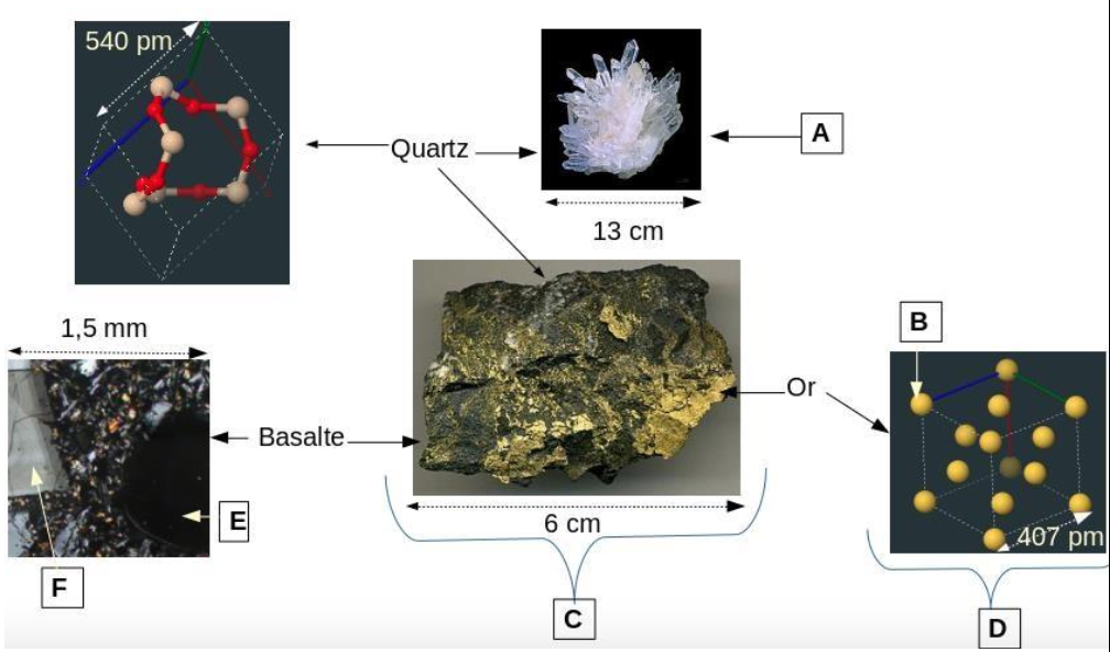 2 – a- Dans ce minerai, identifier la ou les parties cristallines et la ou les parties amorphes parmi les éléments A à F. Justifiez votre réponse à l’aide du document 1 et de vos connaissances.