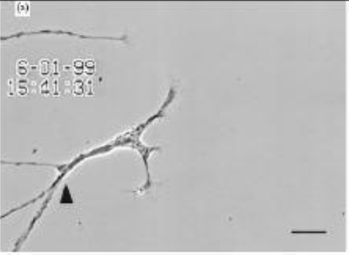 Avant exposition au méthyl-mercure, la cellule nerveuse mesure 120μm (entre la flèche noire et l’extrémité).