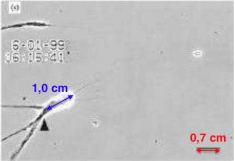 Après une exposition de 10 minutes au méthyl-mercure, la cellule nerveuse mesure 107 μm (entre la flèche noire et l’extrémité).