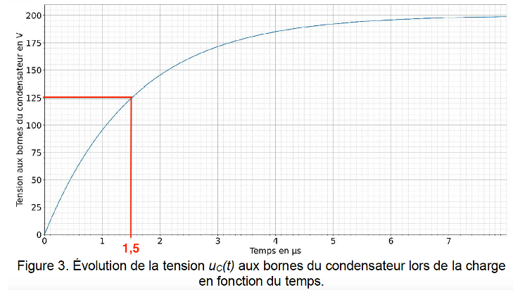La figure 3 représente la tension uC(t) aux bornes du condensateur lors de la charge en fonction du temps.