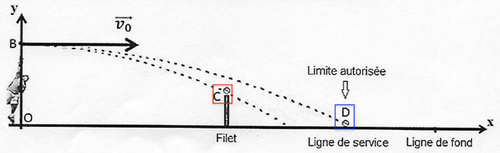 Selon les bases du modèle choisi, la vitesse initiale v0 doit être comprise entre deux valeurs limites : elle doit être supérieure à une valeur minimum v0min afin qu’elle franchisse juste le filet au point C et inférieure à une valeur maximum v0max afin qu’elle retombe dans les limites autorisées au point D.