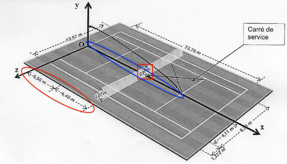 La masse de la balle dont le mouvement est modélisé est m = 58 g. Le service est effectué à plat. La balle sera modélisée par un point correspondant à son centre de masse G. L’étude est réalisée dans le référentiel terrestre supposé galiléen. Plusieurs hypothèses seront faites dans le cadre de cette modélisation :