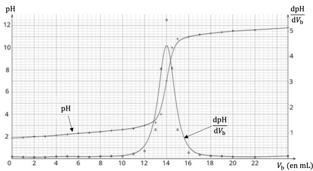 Par lecture graphique (au max de la dérivée de pH), on lit $V_e=14,0\ mL$