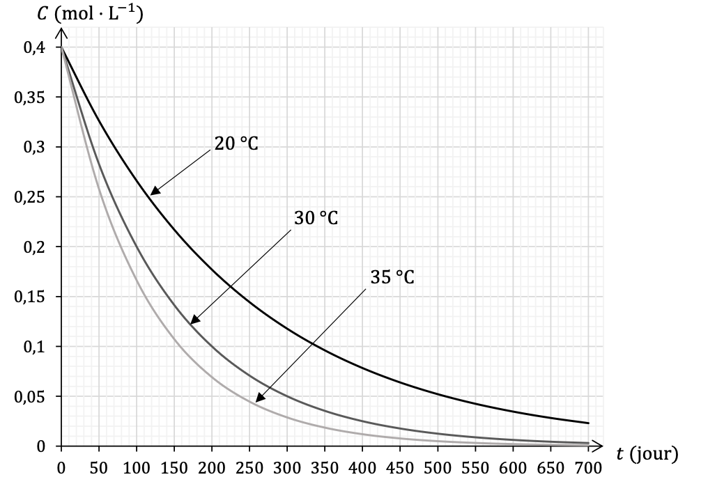 Le document 3, page 6, montre l’évolution au cours du temps de la concentration 𝐶 en ions hypochlorite de trois solutions identiques à celle de l’étudiant, conservées dans des conditions de températures différentes.