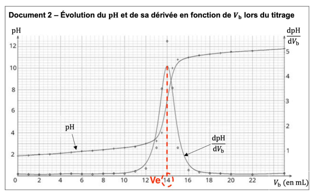 On prélève à la pipette jaugée le volume 𝑉S = 20,0 mL de la solution S et on réalise un titrage avec suivi pH-métrique. Le document 2, page 5, rassemble les mesures de pH représentées en fonction du volume 𝑉b de soude versée ; la dérivée dpH/d𝑉b est également représentée.