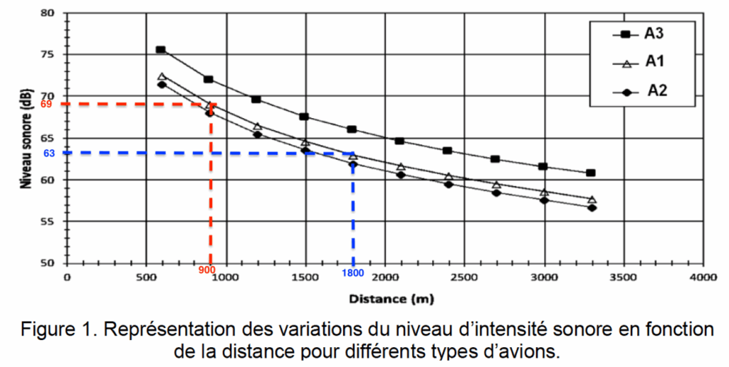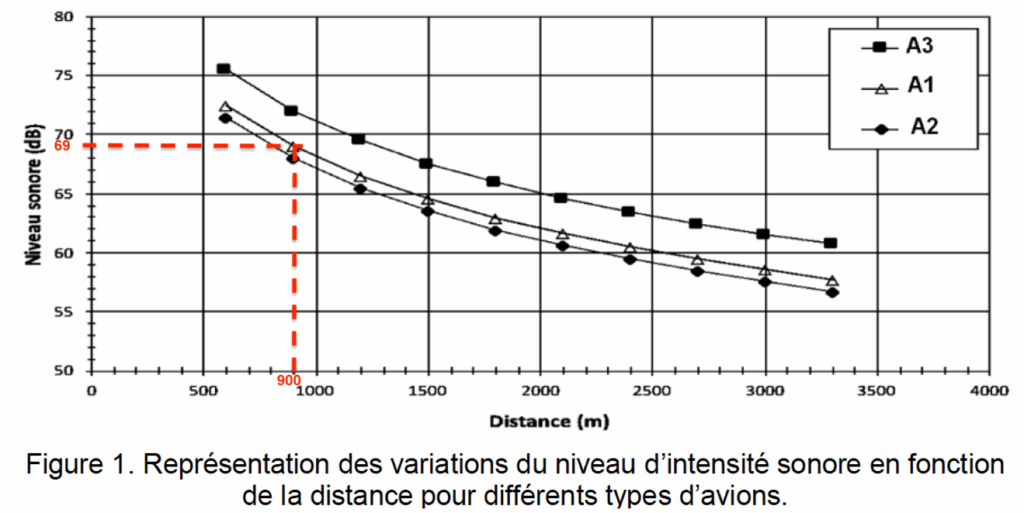 La figure 1 représente les variations du niveau d’intensité sonore (en dB) en fonction de la distance (en m) pour trois avions de type A1, A2 et A3.