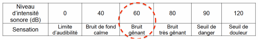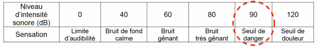 | Niveau d’intensité sonore (dB) | 0 | 40 | 60 | 80 | 90 | 120 |