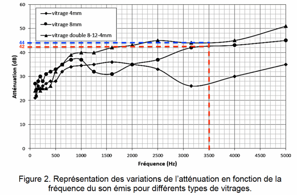 Pour une fréquence de 3500 Hz, l’atténuation est de 42 dB pour un vitrage de 8 mm et de 44 dB pour un vitrage double 8–12–4 mm.