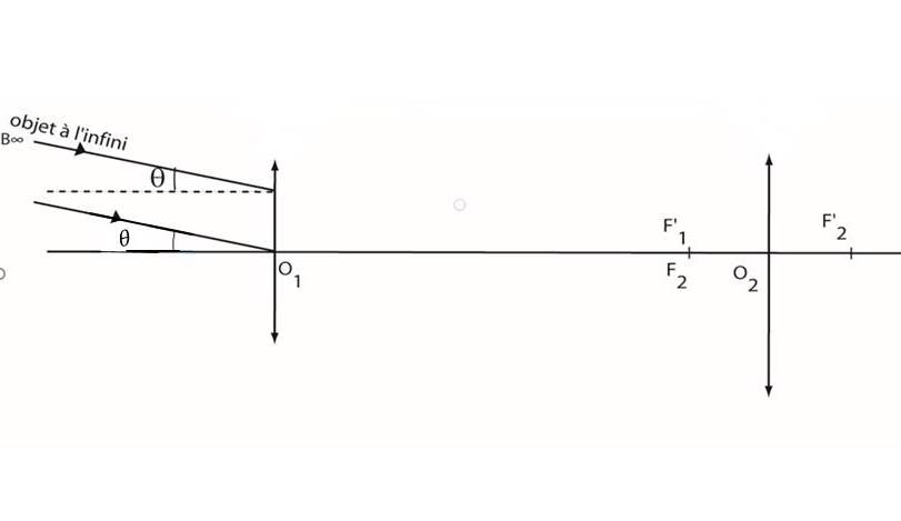 On ajuste ensuite la position des deux lentilles de telle sorte que le foyer image F1‘ de la première lentille coïncide avec le foyer objet 𝐹2 de la seconde lentille.