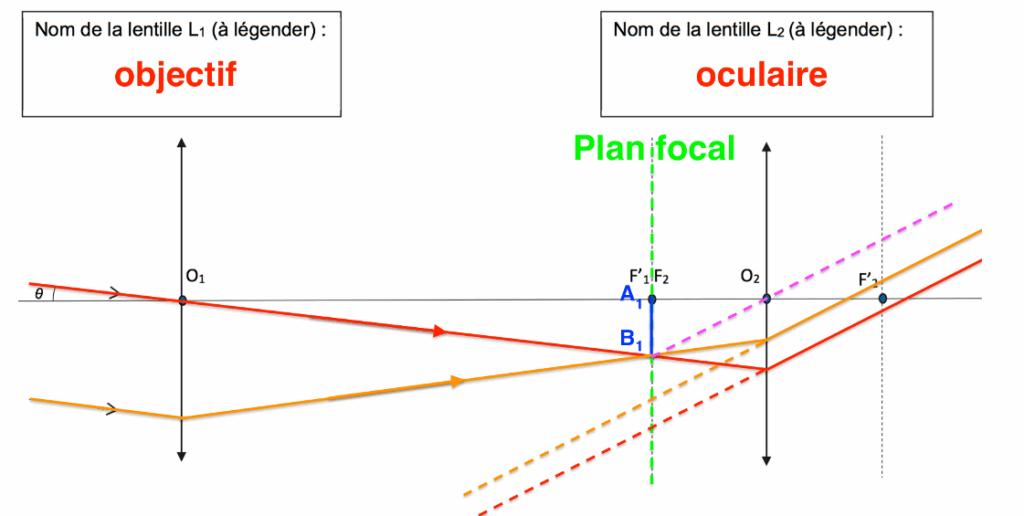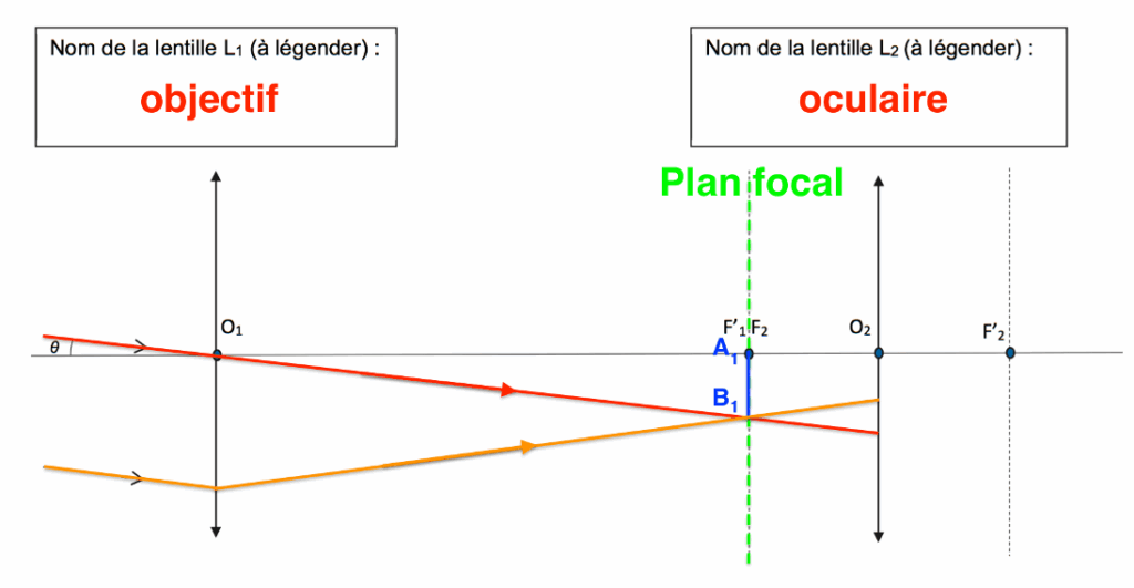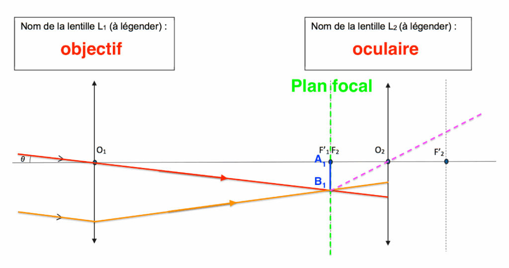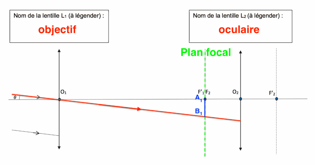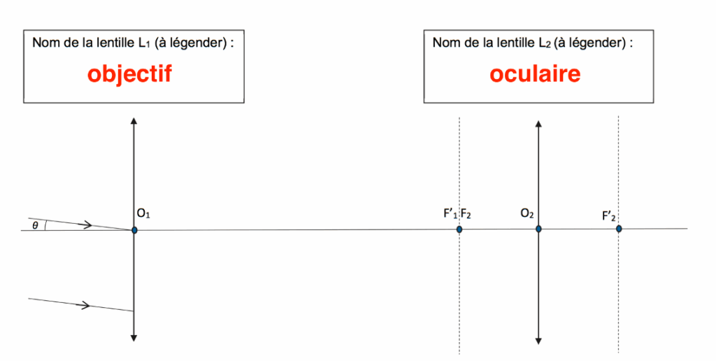 Q3. Construire, sur la figure de l’ANNEXE À RENDRE AVEC LA COPIE, l’image d’un objet à l’infini vu sous un angle θ, formée par la lunette astronomique, en construisant l’image intermédiaire et en faisant apparaître l’angle θ’, angle sous lequel est vue l’image finale en sortie de lunette.