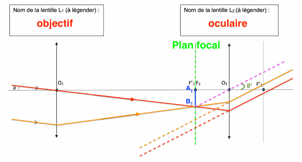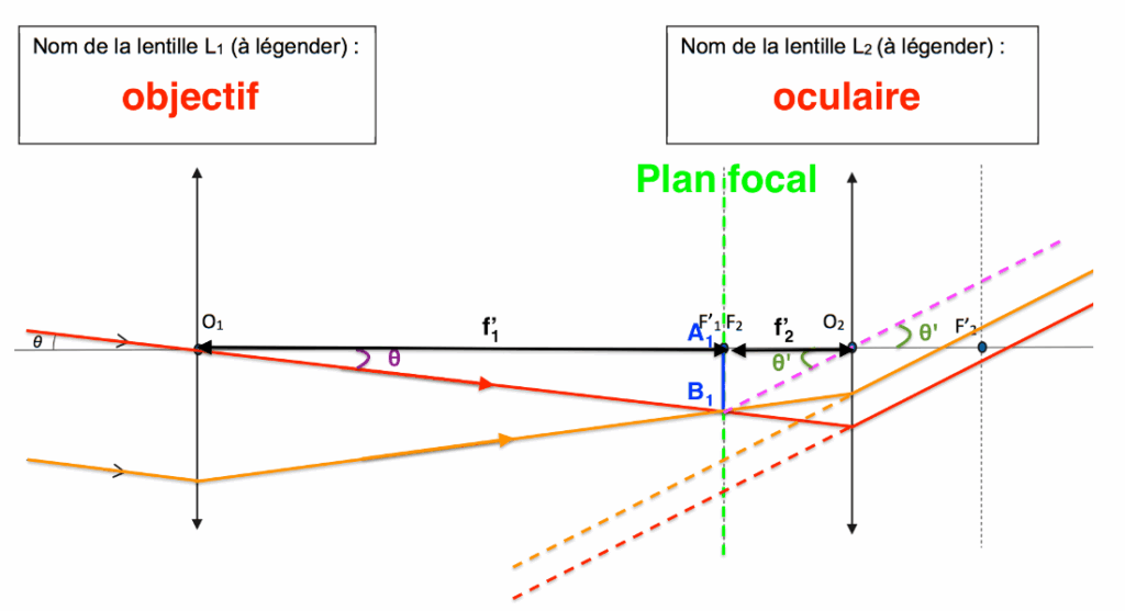 $\theta^\prime$ est l’angle sous lequel est vue l’image finale en sortie de lunette.